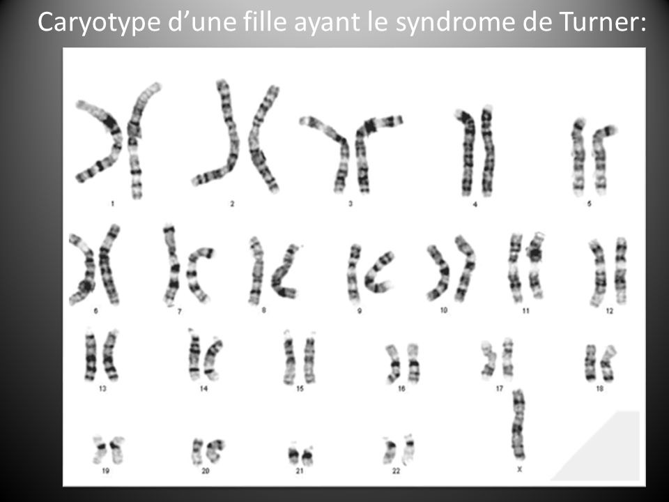 - manque de chromosomes : la monosomie, où il n'y a qu'un seul CR sur une paire (ex : le syndrome de Turner avec un seul CR X).